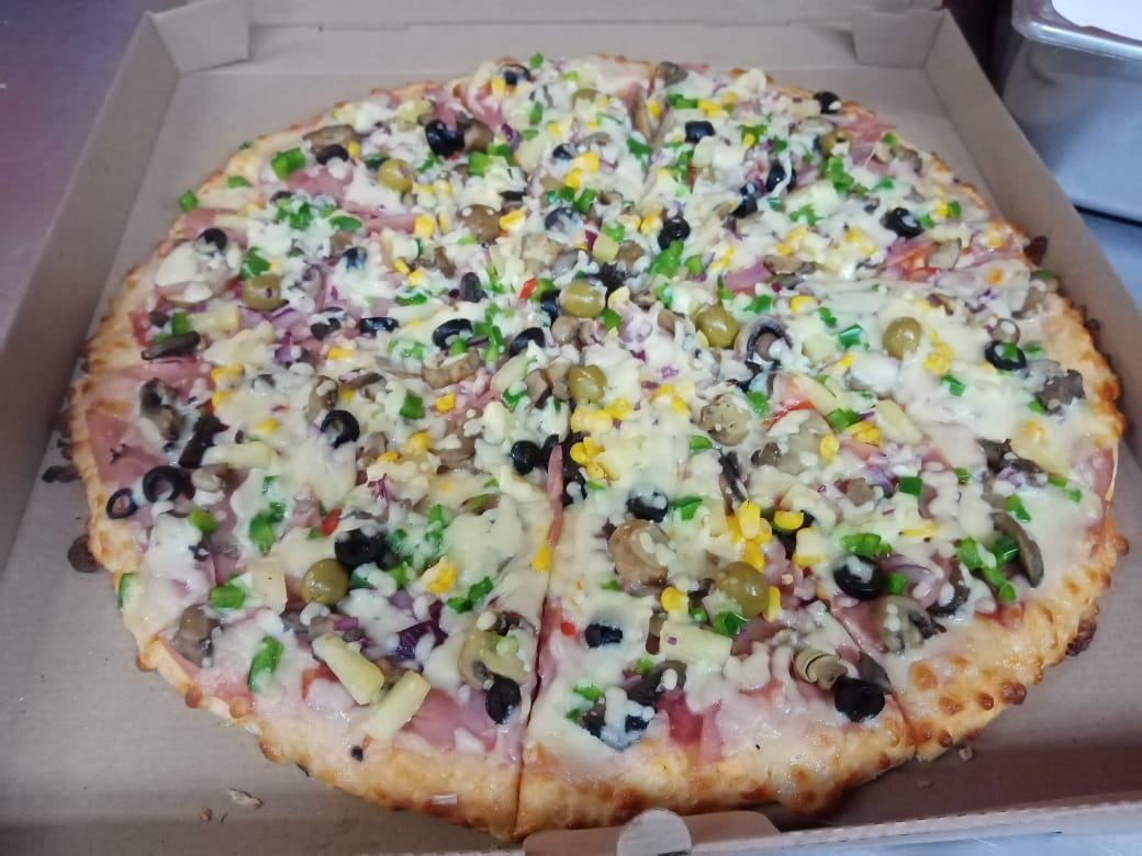 Jamón, pepperoni, salchicha, piña, aceituna verde, aceituna negra, elote, cebolla, pimiento morrón.