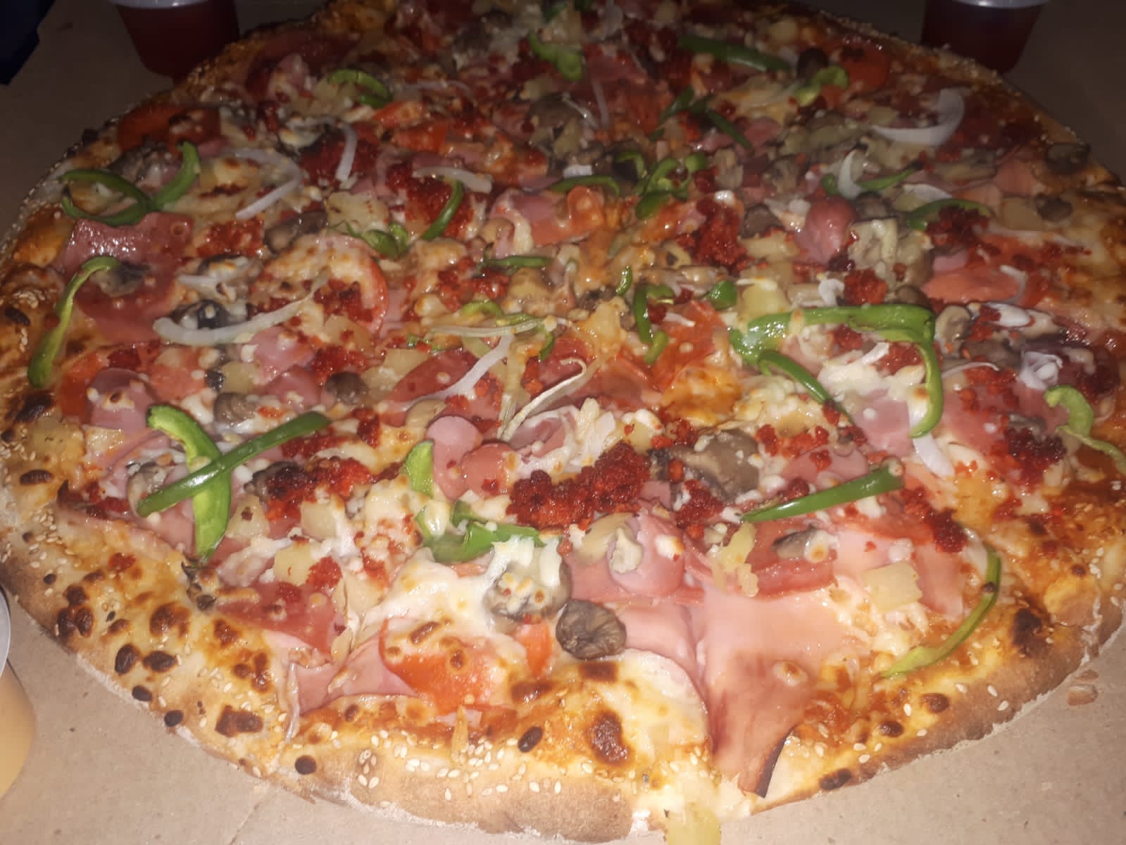 Pizza de masa artesanal cubierta de ajonjolí con salsa de tomate, queso, jamón, salami, pepperoni, salchicha, chorizo, morrón, cebolla, piña y champiñón. Refresco de obsequio pizza mediana y grande 1.700 lt, Pizza personal 400 Ml
