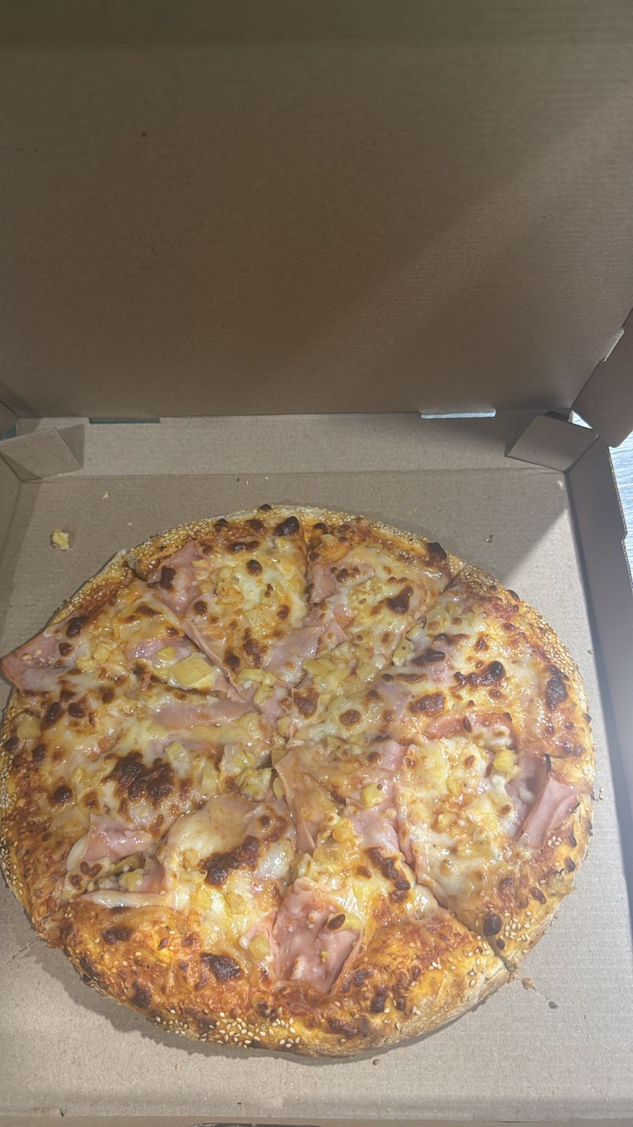 Pizza de masa artesanal cubierta de ajonjolí con salsa de tomate queso, jamo y piña. Refresco de obsequio pizza mediana y grande 1.700 lt, Pizza personal 400 Ml