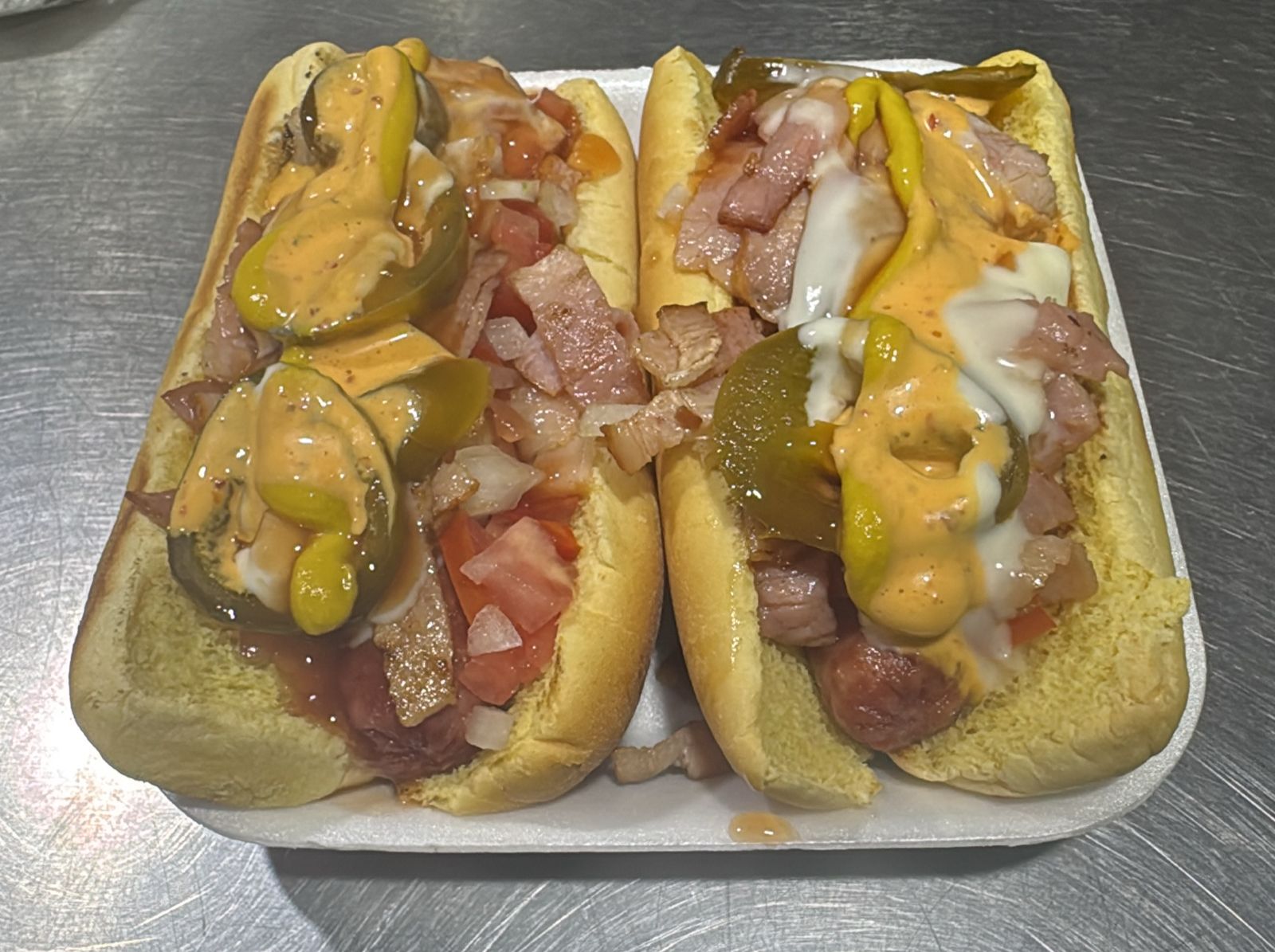 Pan de perrito, tocino, jitomate, cebolla, jalapeño, chimichurri, cátsup, mostaza y crema.