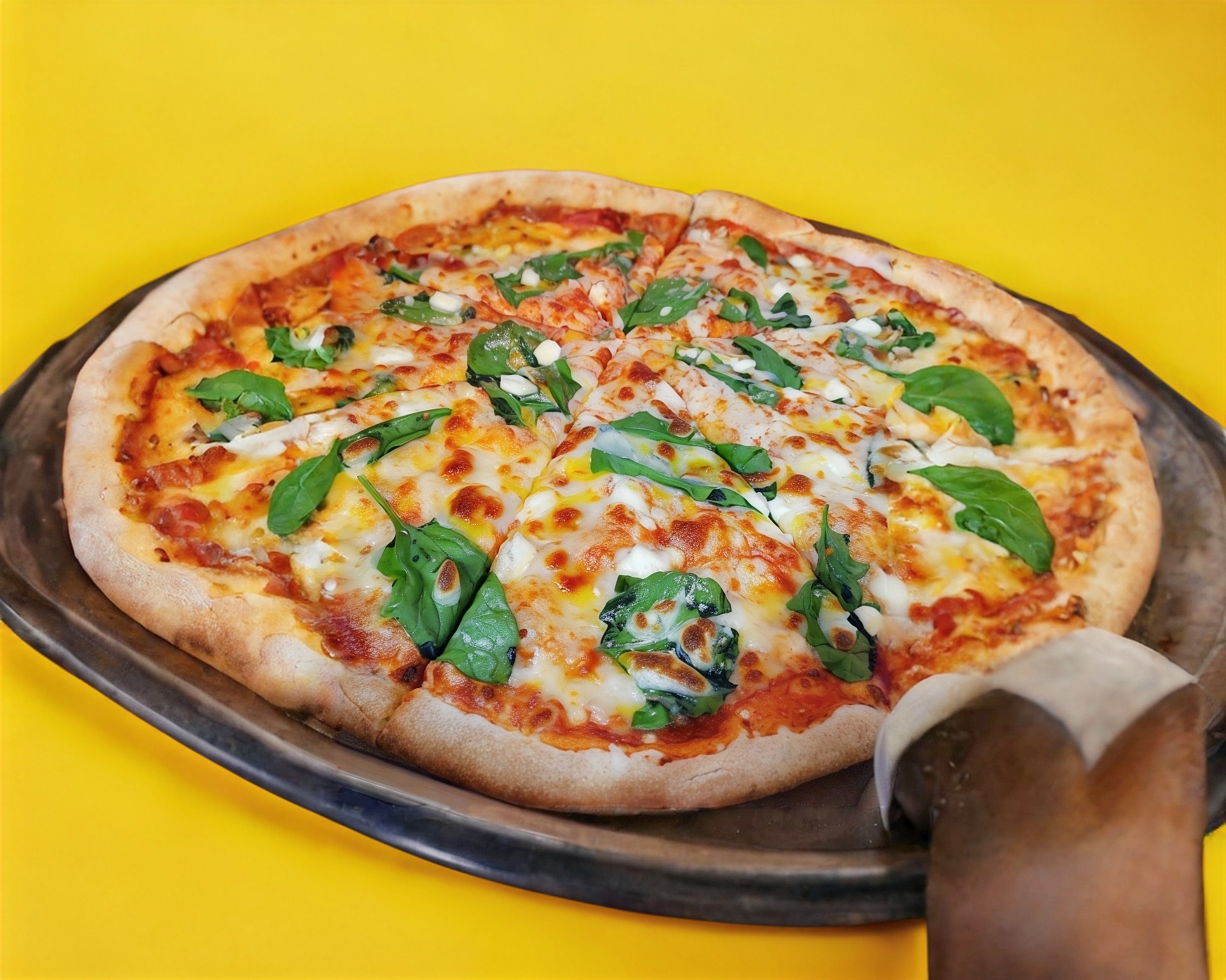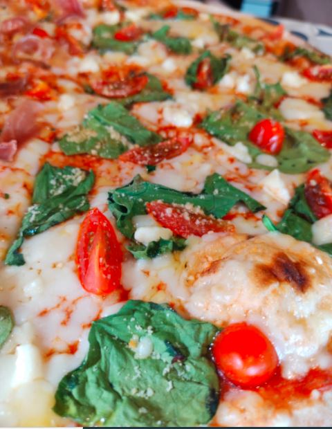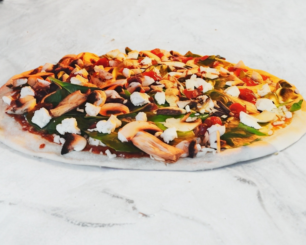 Pizza grande 36 cm. Espinaca fresca, queso de cabra y espolvoreada de queso parmesano. Todas nuestras pizzas son artesanales con pasta delgada, elaboradas al momento, seleccionando ingredientes de calidad y horneadas en horno de piedra a la leña.