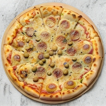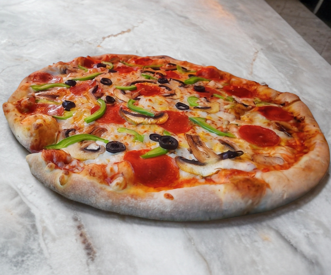 Pizza grande 36 cm. Pepperoni, champiñón, pimiento verde y aceituna negra. Todas nuestras pizzas son artesanales con pasta delgada, elaboradas al momento, seleccionando ingredientes de calidad y horneadas en horno de piedra a la leña.