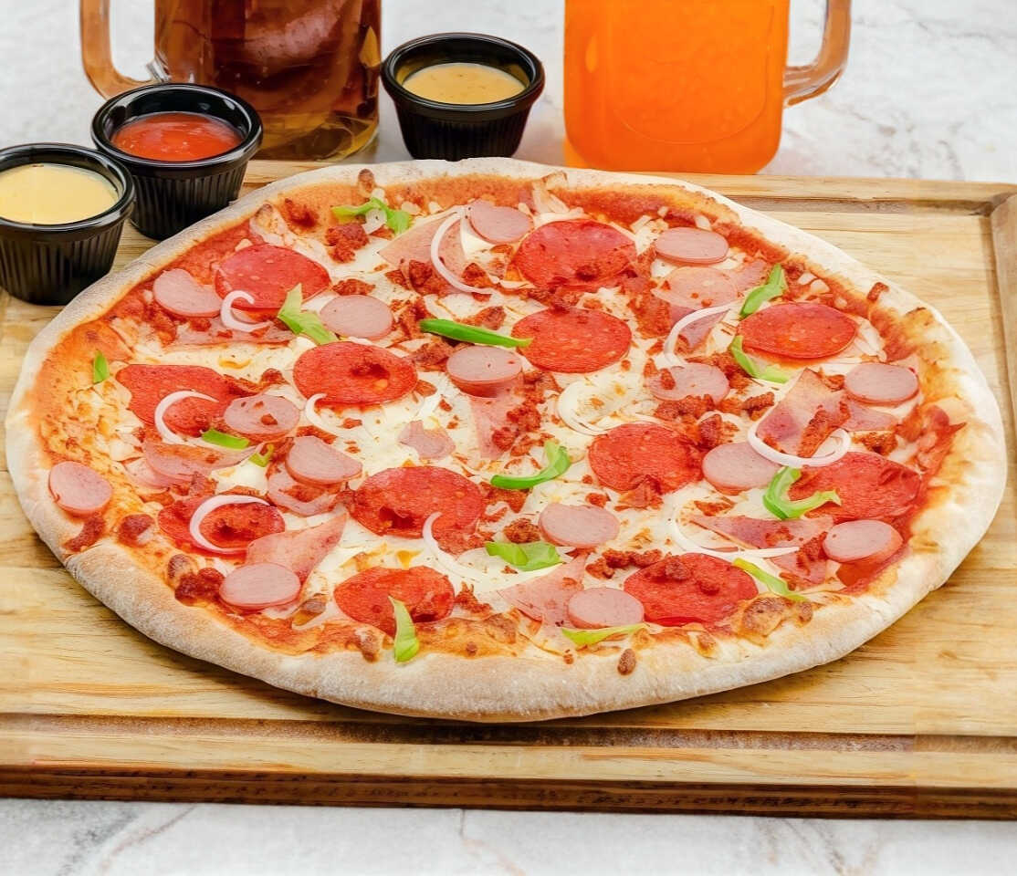 Pepperoni, jamón, salchicha, pimiento verde, cebolla y chorizo.