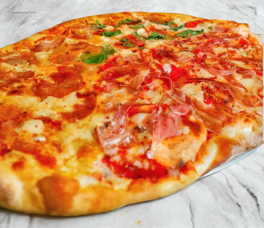 Pizza grande 36 cm. Pizza de jamón serrano acompañada de albahaca fresca. Todas nuestras pizzas son artesanales con pasta delgada, elaboradas al momento, seleccionando ingredientes de calidad y horneadas en horno de piedra a la leña.