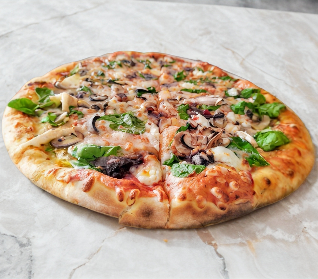 Pizza grande 36 cm. Champiñón natural fileteado con queso mozzarella. Todas nuestras pizzas son artesanales con pasta delgada, elaboradas al momento, seleccionando ingredientes de calidad y horneadas en horno de piedra a la leña.