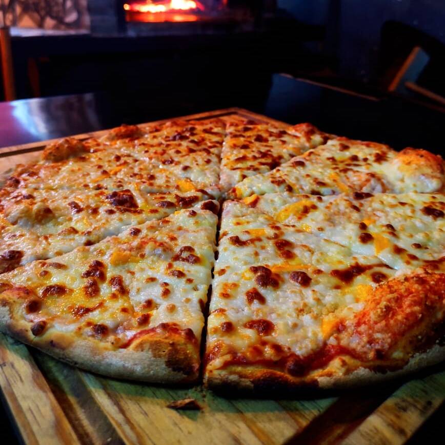 Pizza grande 36 cm. Mezcla de queso mozzarella, americano y parmesano. Todas nuestras pizzas son artesanales con pasta delgada, elaboradas al momento, seleccionando ingredientes de calidad y horneadas en horno de piedra a la leña.