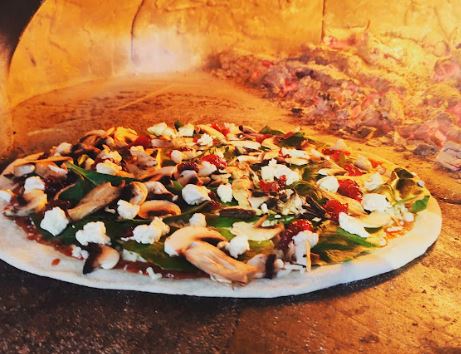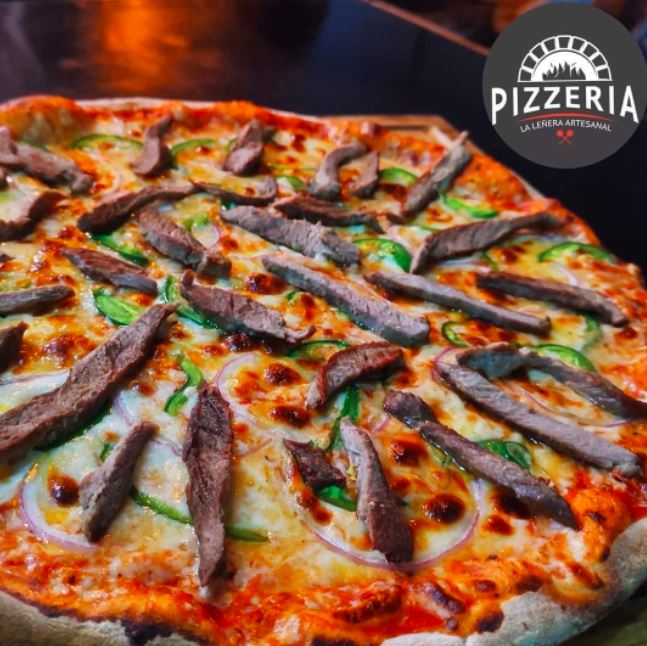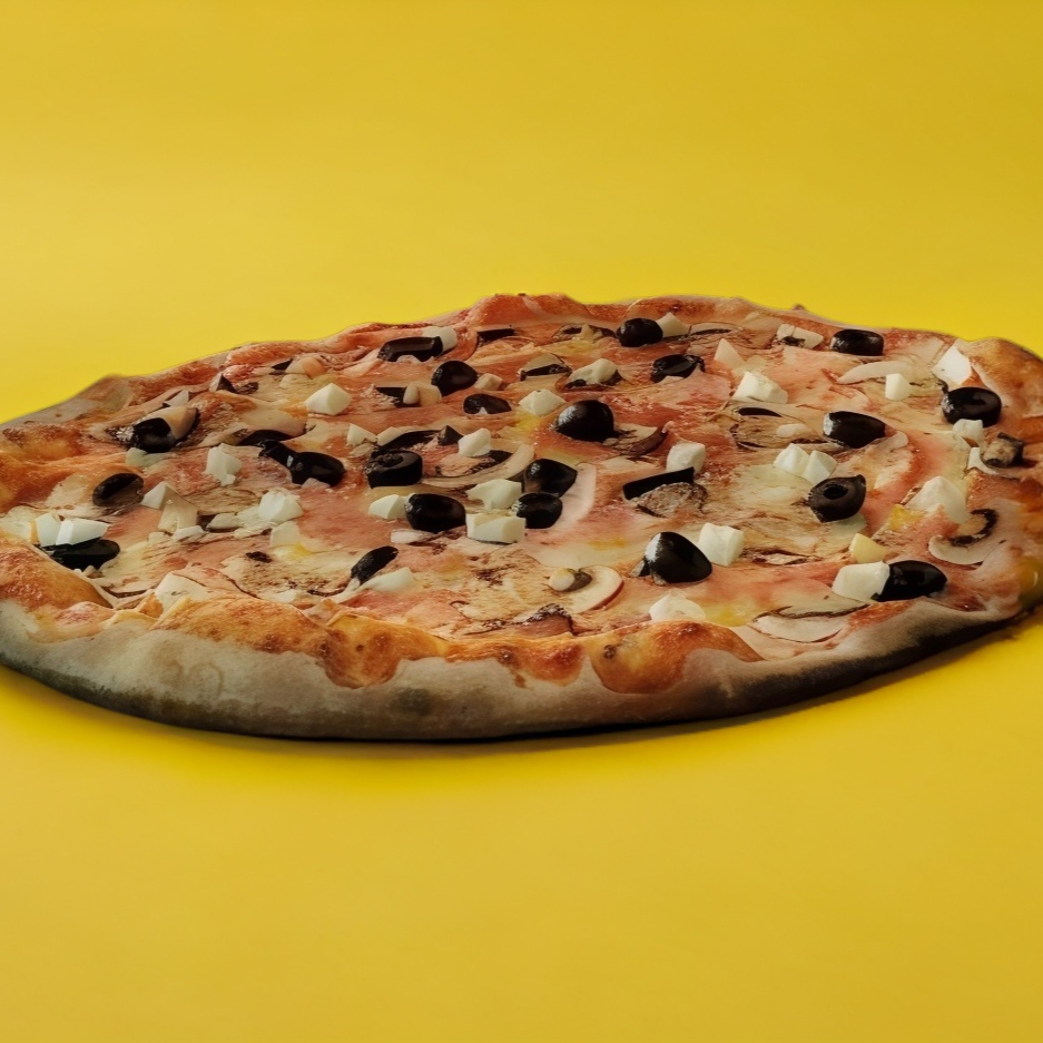 Pizza grande 38 cm. Queso de cabra, jamón, champiñón, aceituna negra. Todas nuestras pizzas son artesanales con pasta delgada, elaboradas al momento, seleccionando ingredientes de calidad y horneadas en horno de piedra a la leña.