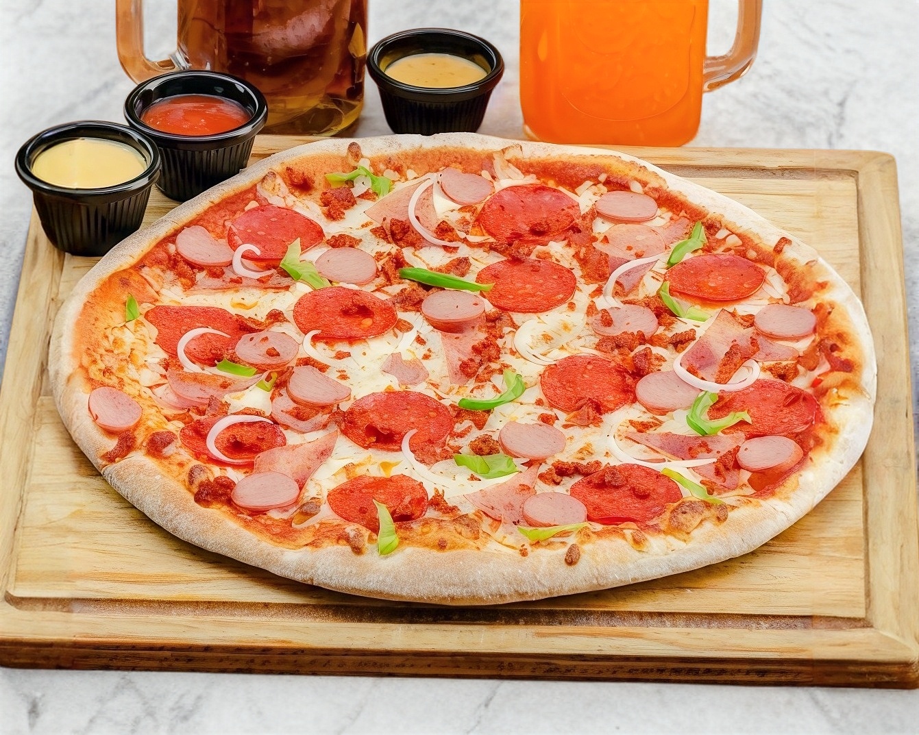 Pepperoni, jamón, salchicha y tocino. Todas nuestras pizzas son grandes de 38 cm, nuestras pizzas son artesanales con pasta delgada, elaboradas al momento, seleccionando ingredientes de calidad y horneadas en horno de piedra a la leña.