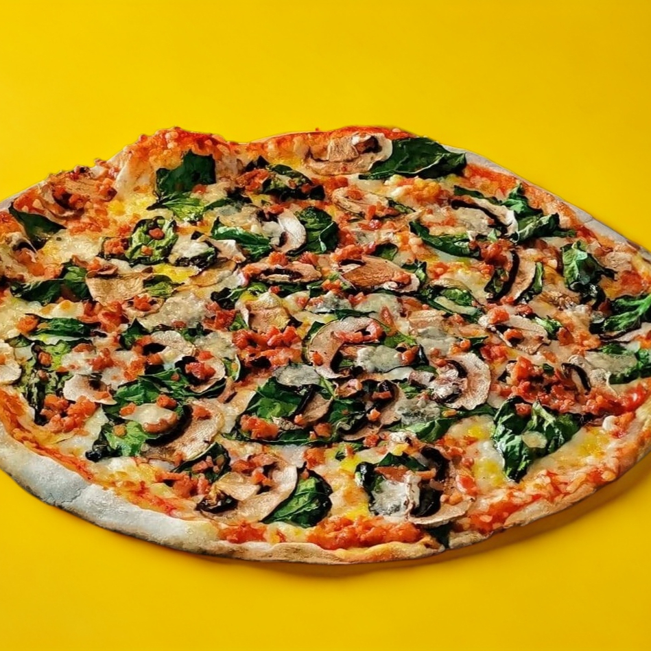 Pizza grande 38 cm. Espinaca, champiñón, queso azul y tocino. Todas nuestras pizzas son artesanales, se caracteriza por ser de pasta delgada, son elaboran al momento, seleccionando ingredientes frescos artesanales e importados de calidad, se hornean en horno de piedra a la leña.