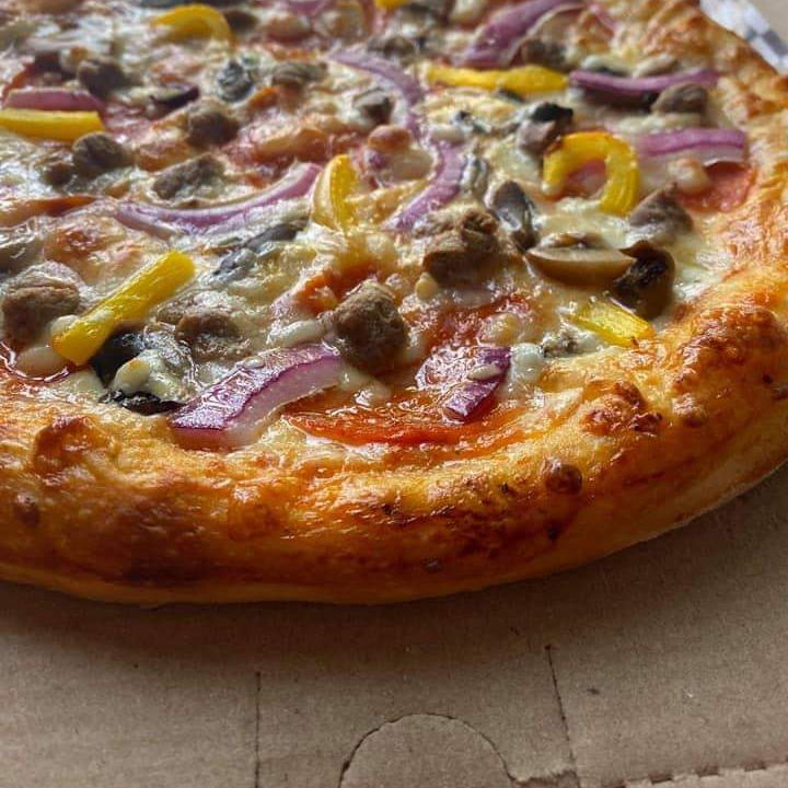 Jamón, salchicha, salami, piña, pimiento, cebolla, aceitunas negras.