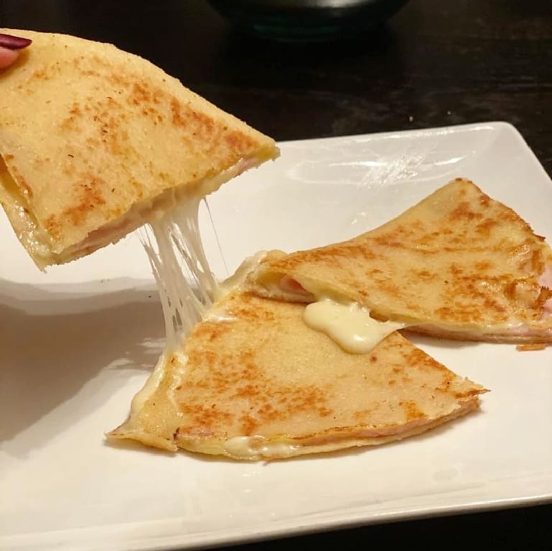 Tocino y queso asadero gratinado.