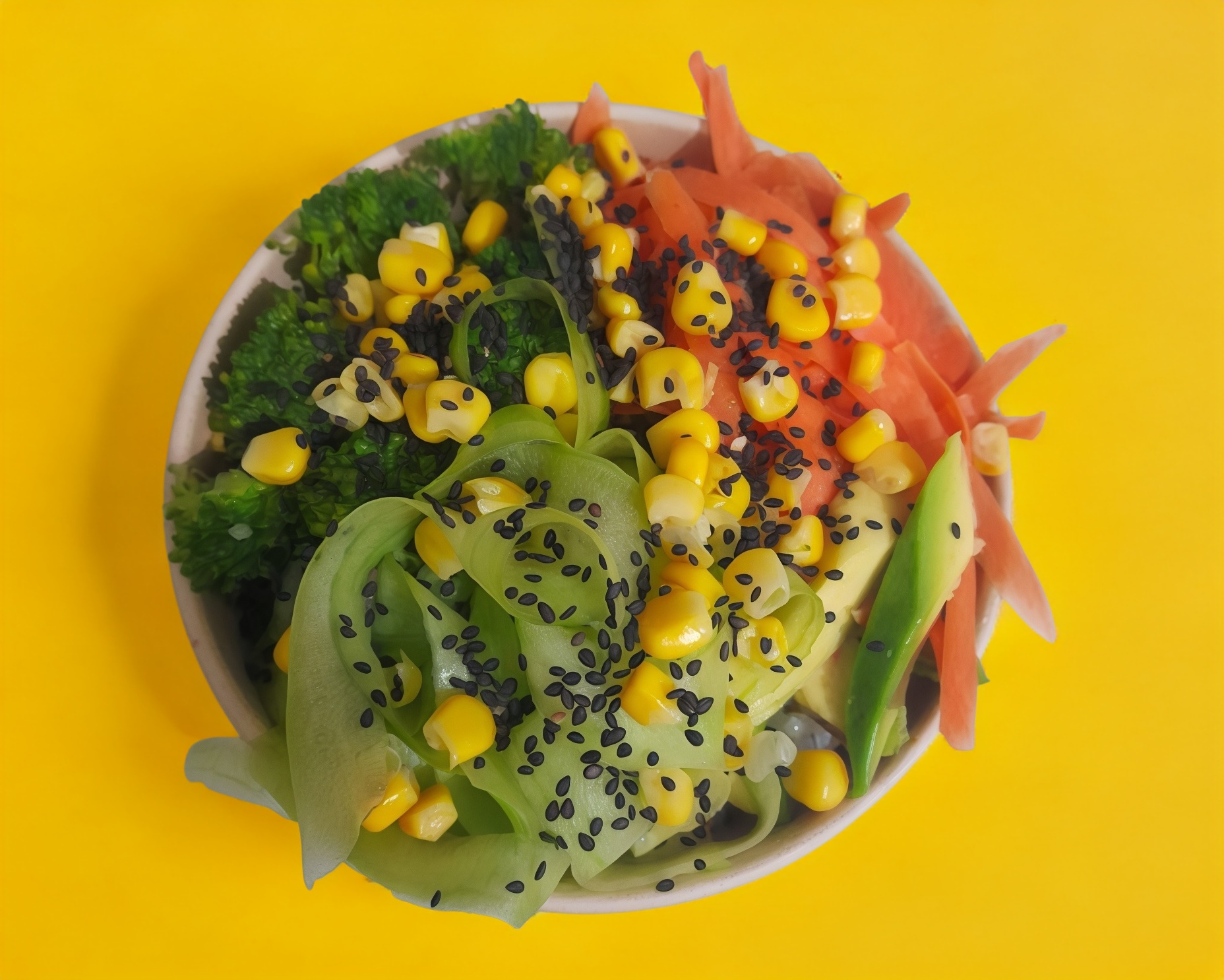 Arroz, pepino, aguacate, zanahoria, brócoli al vapor, elote amarillo mas dip de chipotle.
