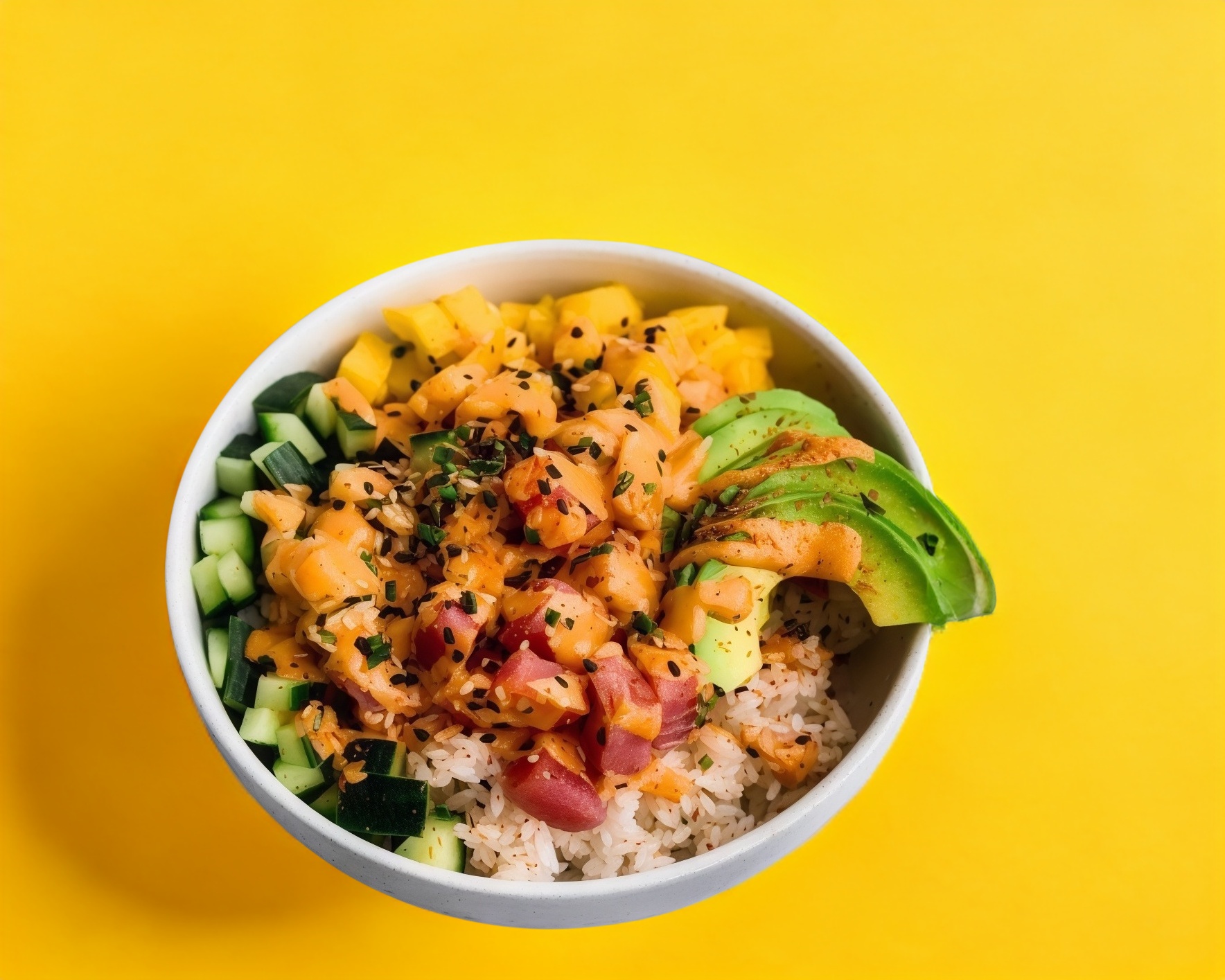 Arroz, granos de elote amarillo, zanahoria, aguacate, atún, mas dip tampico.