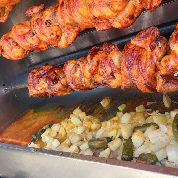 Promocion de domingo 2 pollos enteros po 300 solo el dia domingo incluye sus verduras sopa cebolla asada chile asado tortillas