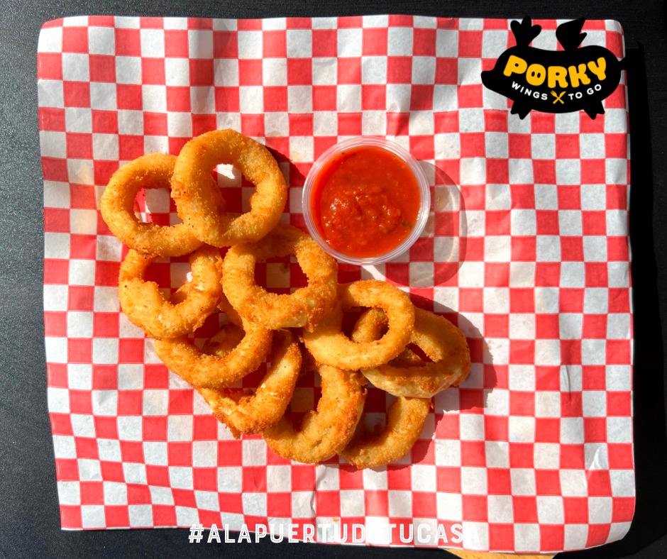 10 piezas de aros de cebolla, acompañado de salsa Prego