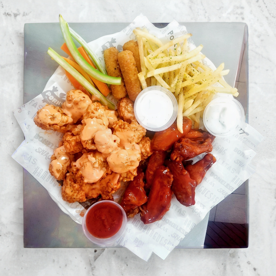 Alitas 500 gr.*1 + 500 gr. de Boneless*1 + 3 Dedos de Queso*1 + Papas (150 Gr)*1 + Porcion de vegetales*1 + Aderezo*2