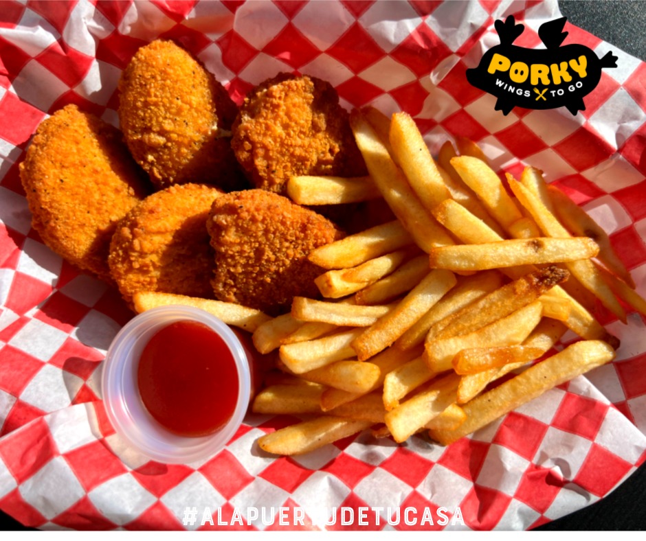 5 piezas de nuggets de pollo acompañados de 100 gr de papas a la francesa