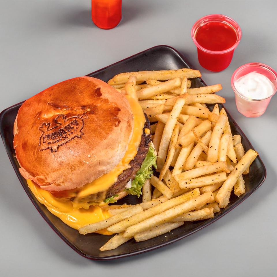 150 gr. de carne de sirloin, tocino, queso blanco, aros de cebolla y BBQ. Acompañado de 150 gr. de papas a la francesa