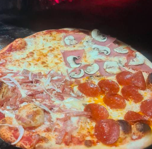 NUEVA PIZZA GRANDE DE 38 CM CON ORILLA RELLENA DE QUESO MOZARELLA DIVIDIDA EN 4 DELICIOSOS SABORES! (JAMON CON CHAMPIÑONES, TOCINO CON CEBOLLA, PEPPERONI Y QUESO)