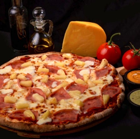 Pizza Grande de 38 cm con orilla rellena de queso Mozarella: Elaborada Artesanalmente con Masa Madre, cocida en Horno de Piedra a la Lena, Pasta de Tomate Pellati Italiana, Queso Mozarella Autentico (Real California Milk) + JAMON Y PIÑA