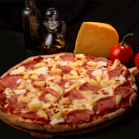 Pizza Grande de 38 cm Elaborada Artesanalmente con Masa Madre, cocida en Horno de Piedra a la Lena, Pasta de Tomate Pellati Italiana, Queso Mozarella Autentico (Real California Milk) + JAMON Y PIÑA
