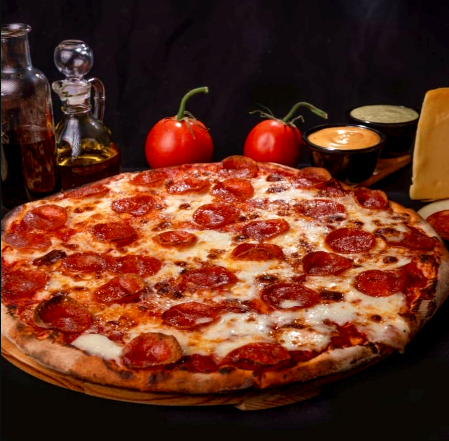 Pizza Grande de 38 cm con orilla rellena de queso Mozarella: Elaborada Artesanalmente con Masa Madre cocida en Horno de Piedra a la Lena, Pasta de Tomate Entero Pellati Italiano y Queso Mozarella Autentico (100% Real California Milk) + PEPPERONI Importado