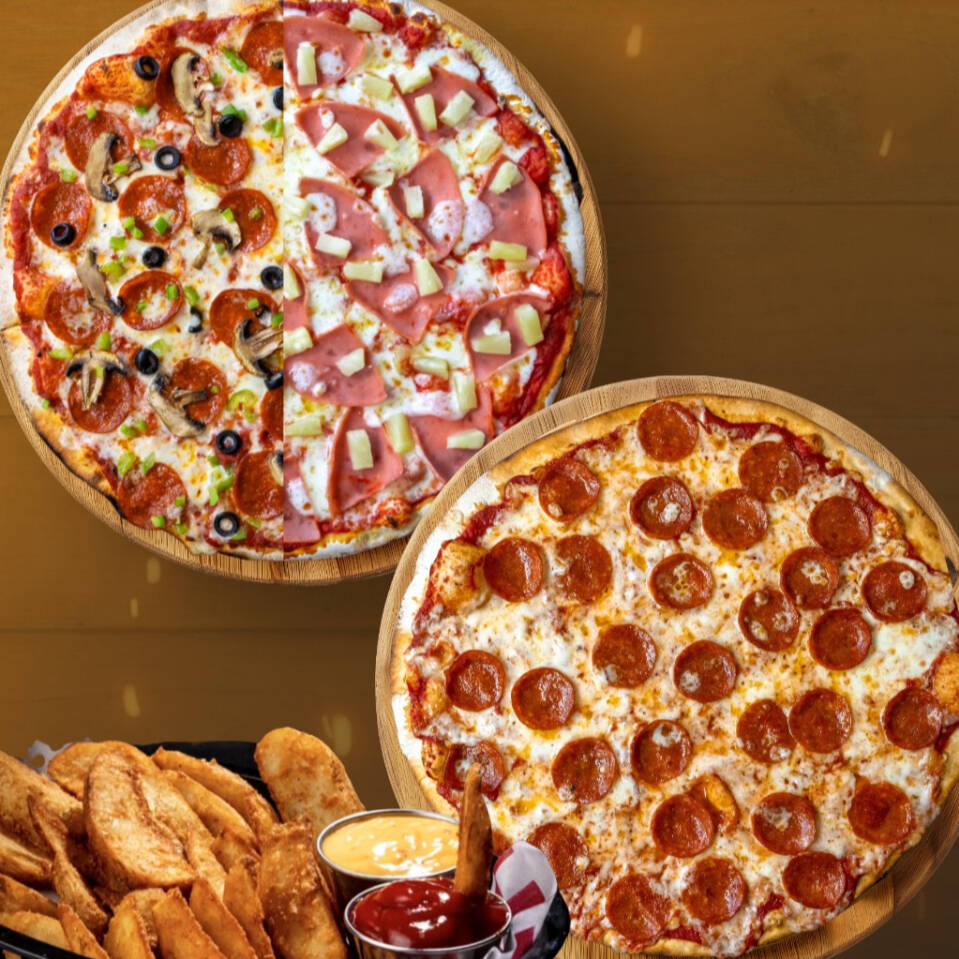 2 pizzas de 2 ingredientes a elegir + 1 orden de papas a la francesa