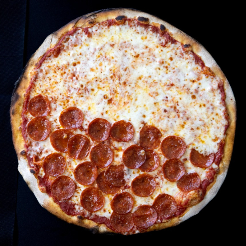 Pizza Grande de 38 cm Elaborada Artesanalmente con Masa Madre cocida en Horno de Piedra a la Lena, Base de Pasta de tomate entero Pellati italiano y Queso Mozarella Autentico (100% Real California Milk) + MITAD PEPERONI + MITAD QUESO