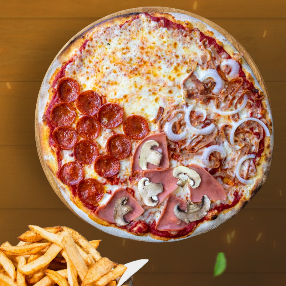 1 Pizza NUEVA 4 ESTACIONES dividida en 4 deliciosos sabores (Jamon con Champiñones, QUESO, Pepperoni y Tocino con Cebolla) + 1 Orden de Papas a la Francesa