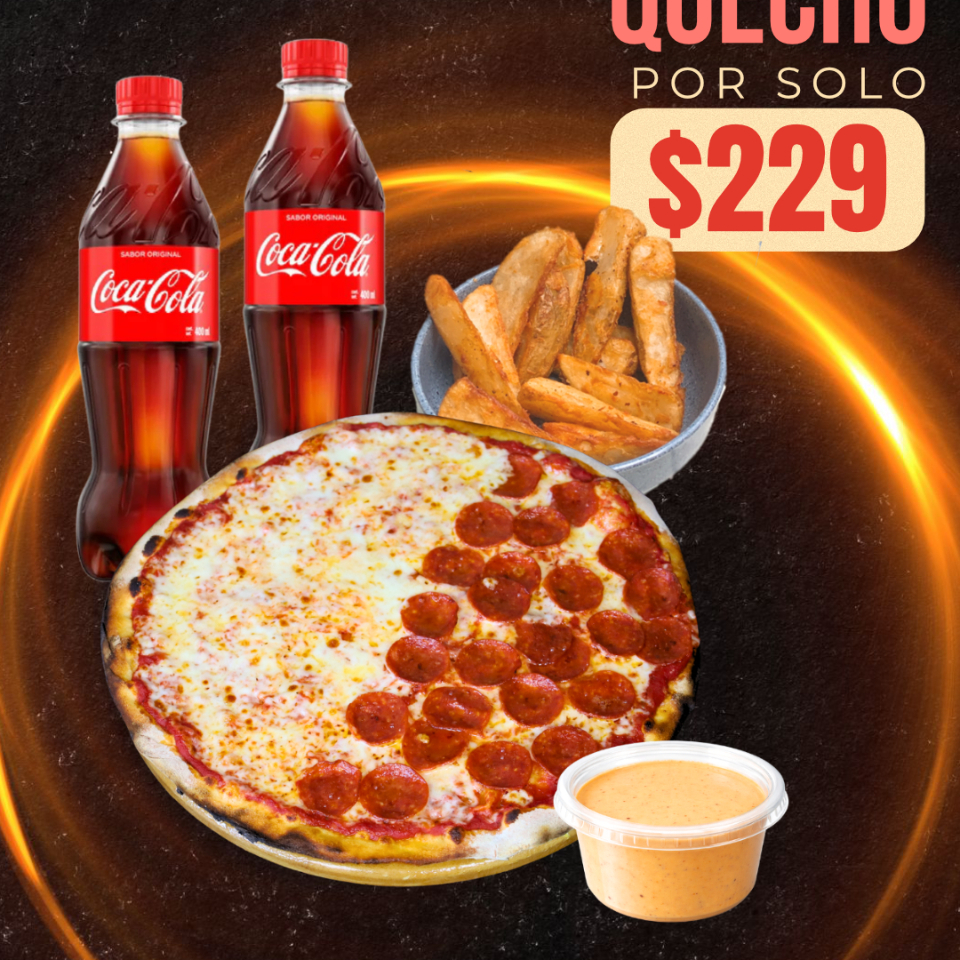 Pizza de mitad Pepperoni y mitad Queso + Quechopapas + 2 refrescos individuales + Aderezo Chimichurri. ¡Todo lo que necesitas para dos!