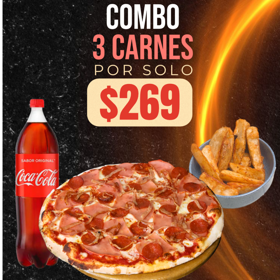 Disfruta de nuestra PIZZA DE 3 CARNES, acompañada de nuestras icónicas Quechopapas (doraditas y con el sazón de la casa) y un refresco para compartir. ¡Es la combinación perfecta que nunca falla!