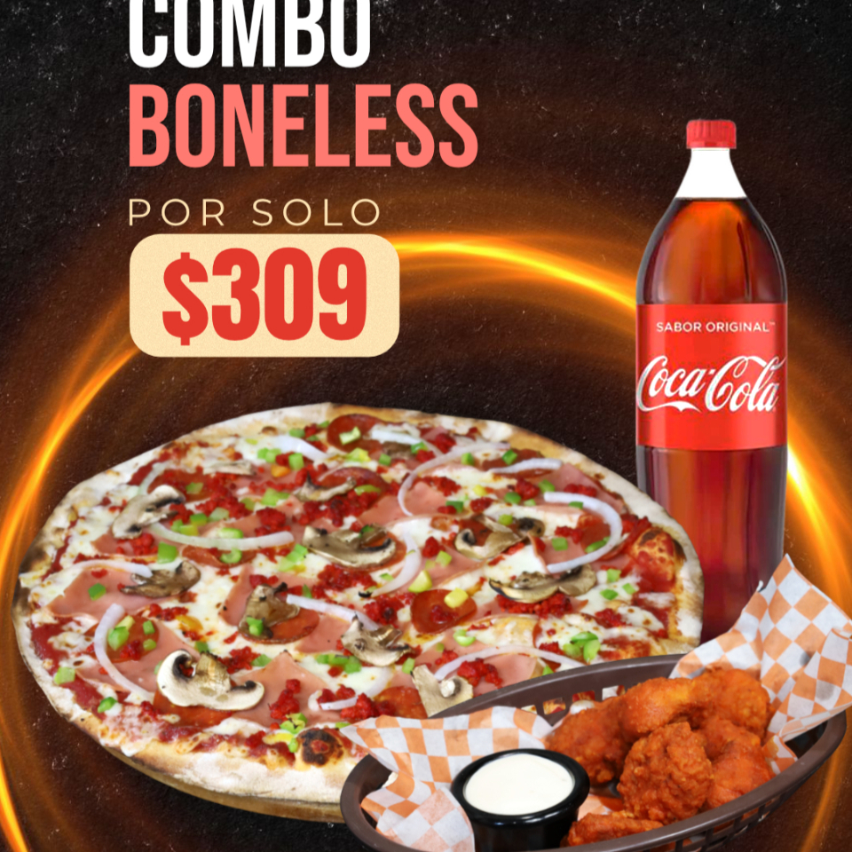Pizza a elegir + Boneless + Refresco familiar. ¡El combo ideal para los que quieren un extra de sabor!