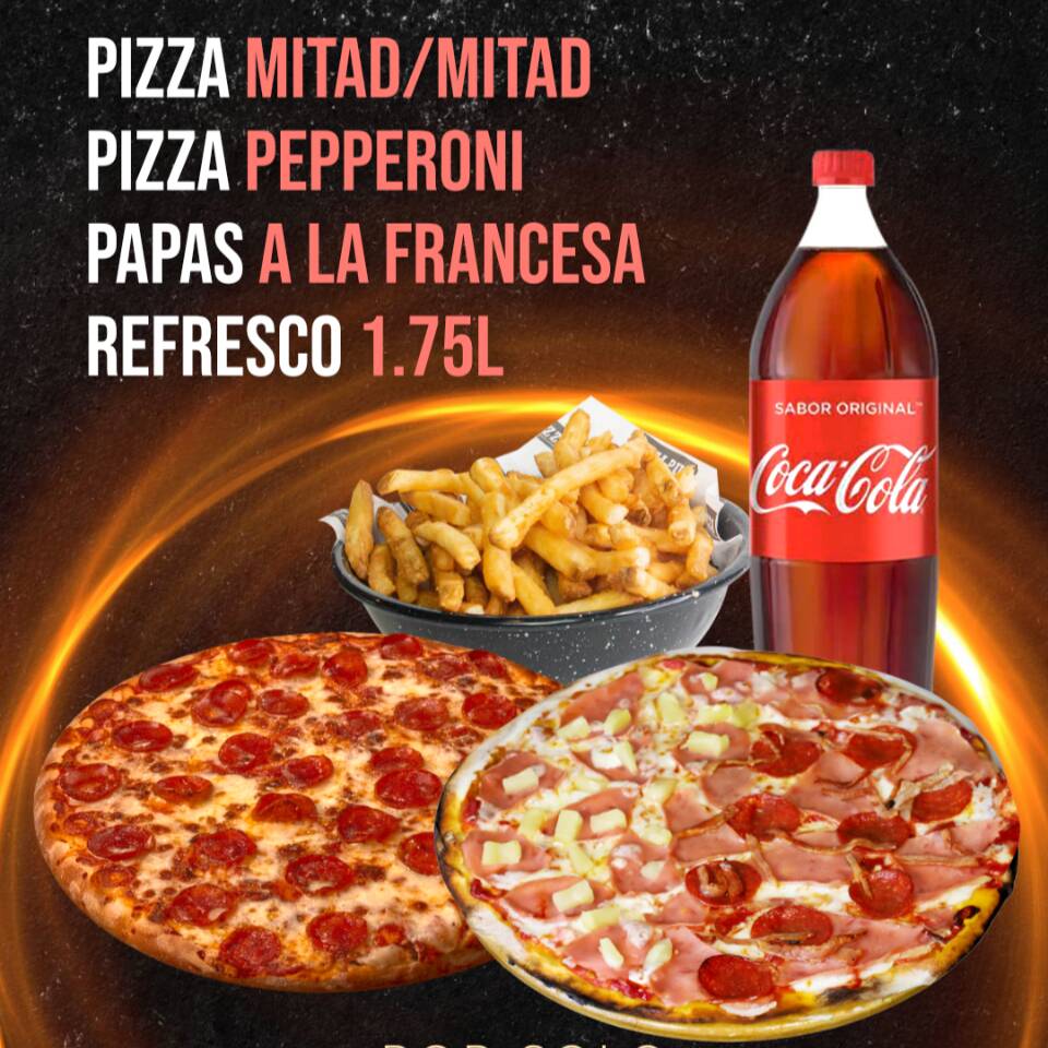 Pizza Mitad/Mitad Especialidades + Pizza de Pepperoni + Papas a la Francesa +Refresco familiar. La solución ideal para que todos queden felices.