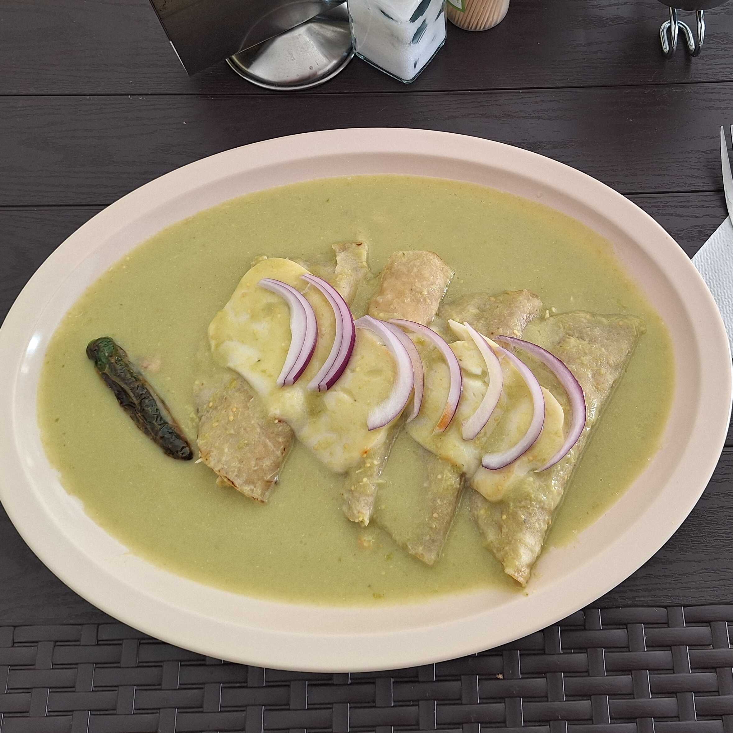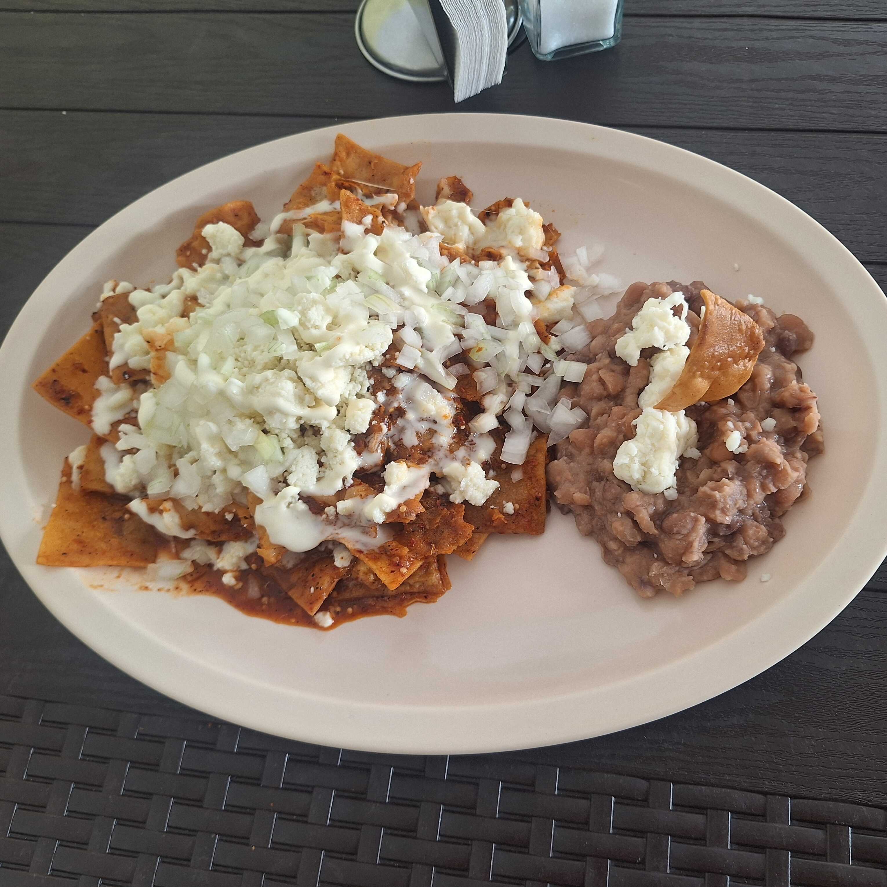 Chilaquiles rojos o verdes (con pollo o huevo) acompañados de frijoles