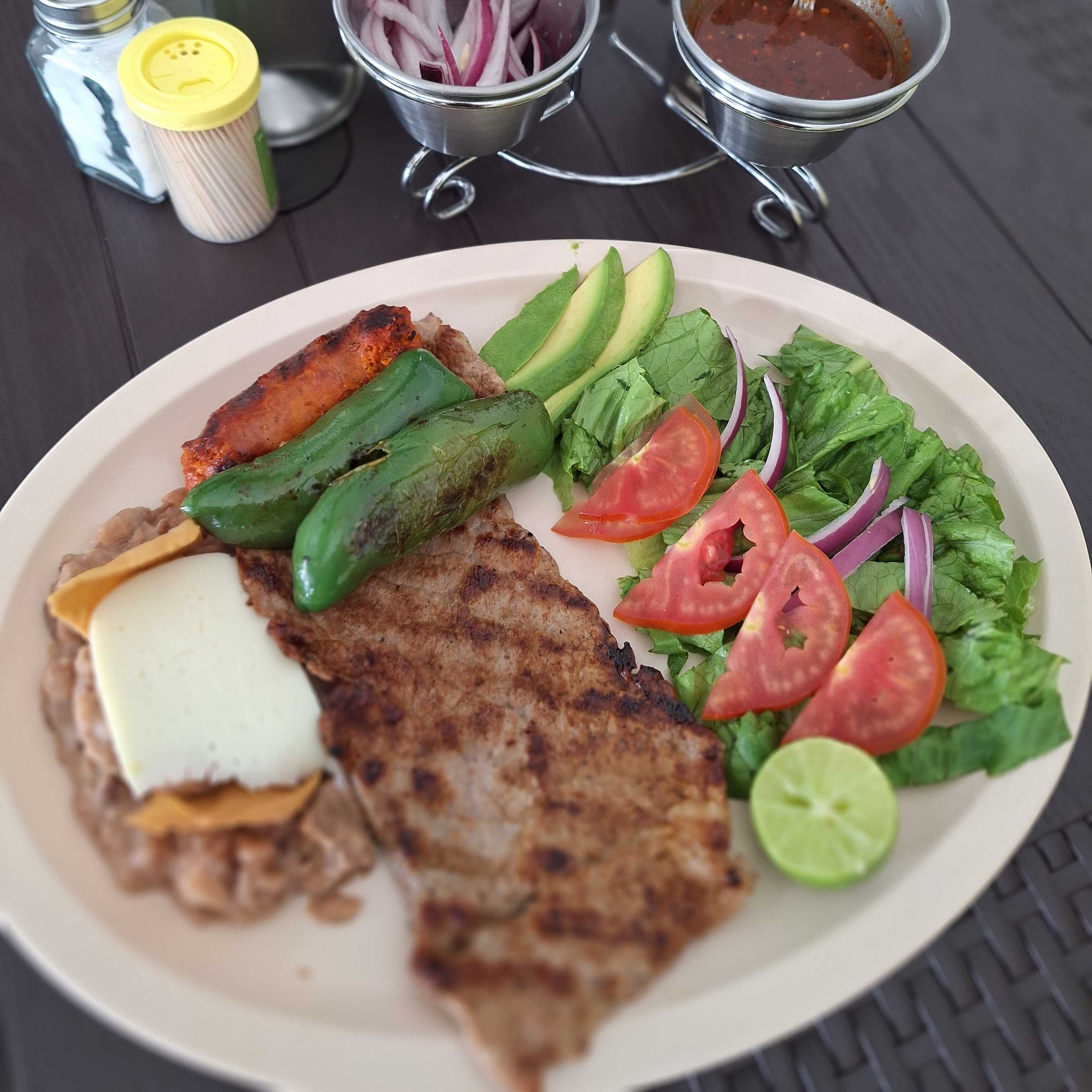 Bistec y chorizo asado acompañado de frijoles o arroz y ensalada