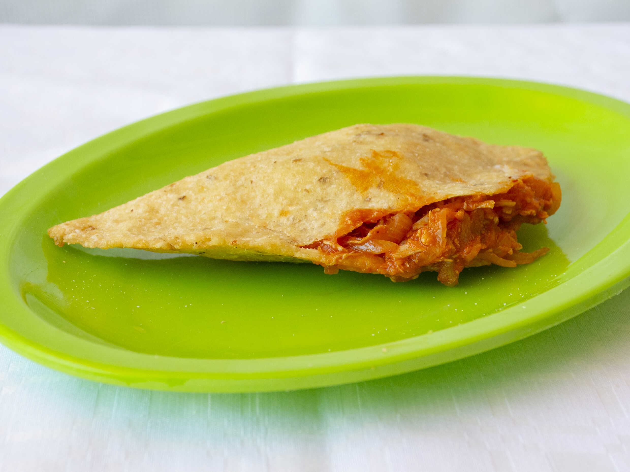 Disfruta de una quesadilla dorada hecha con masa de maíz quebrado, frita hasta quedar crujiente y rellena con queso y el guisado de tu elección. Tamaño aproximado de 15 a 16 cm.