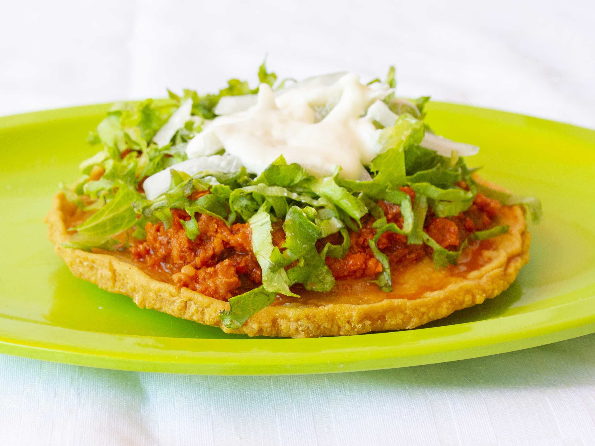Masa molida en círculo dorada en aceite con ingrediente de frijoles preparados con lechuga cebolla y crema