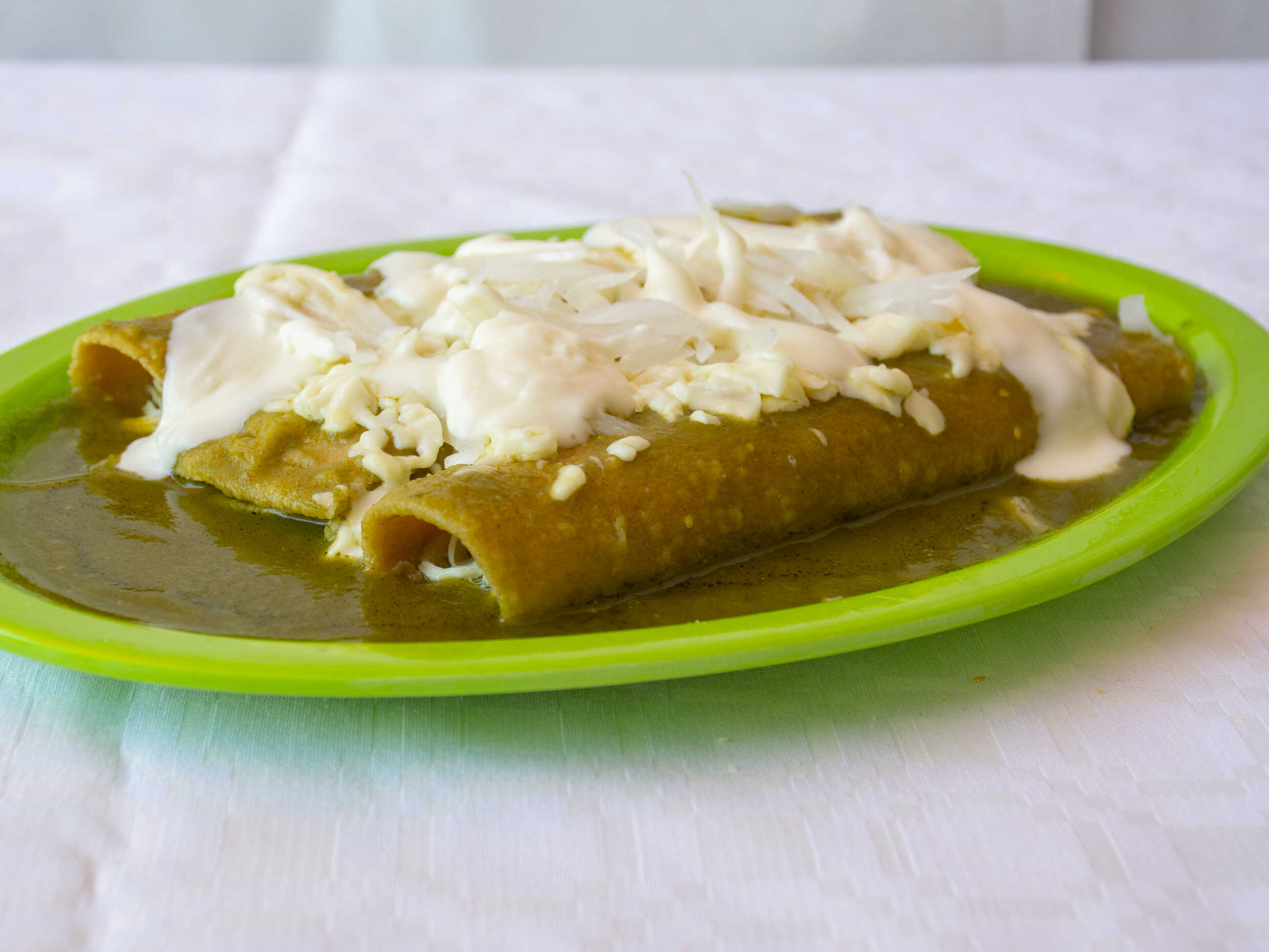 3 Tortillas de maíz grande rellenas de pollo bañadas en salsa verde con queso gratinado llevan cebolla y crema