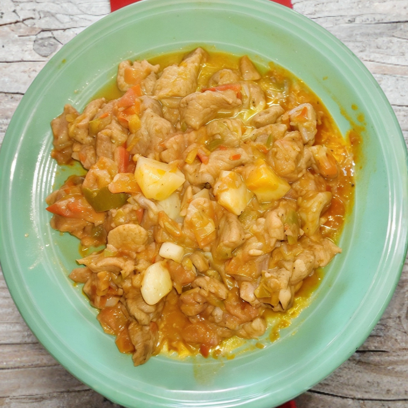 Termo de medio litro de carne de puerco guisado en salsa roja.