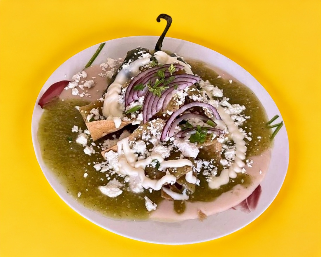 Chile poblano relleno de los chilaquiles de tu preferencia con una cama de frijol y servidos con queso, crema, cebolla y cilantro.
