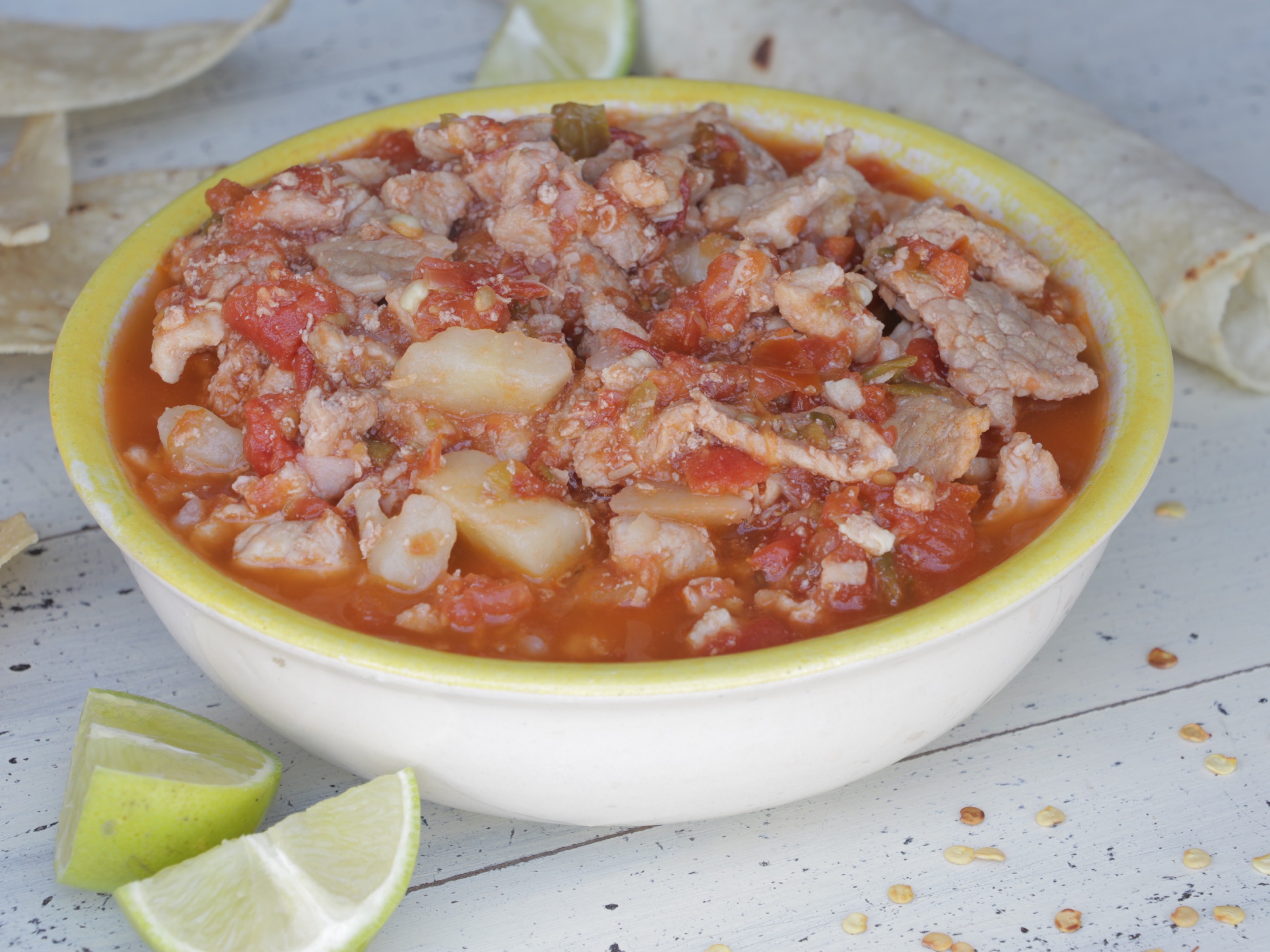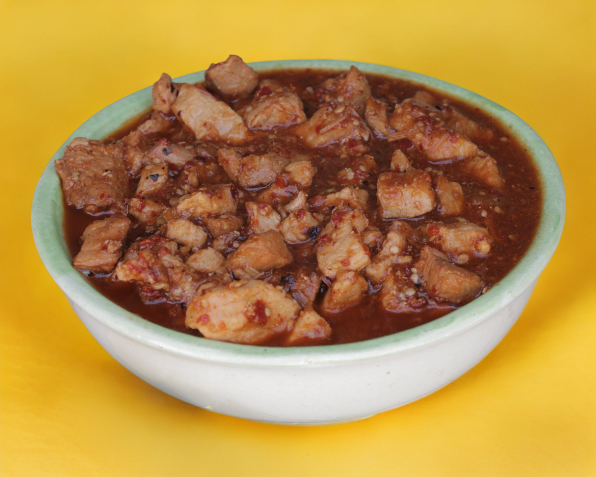 Termo de medio litro de carne de puerco guisado en salsa roja.