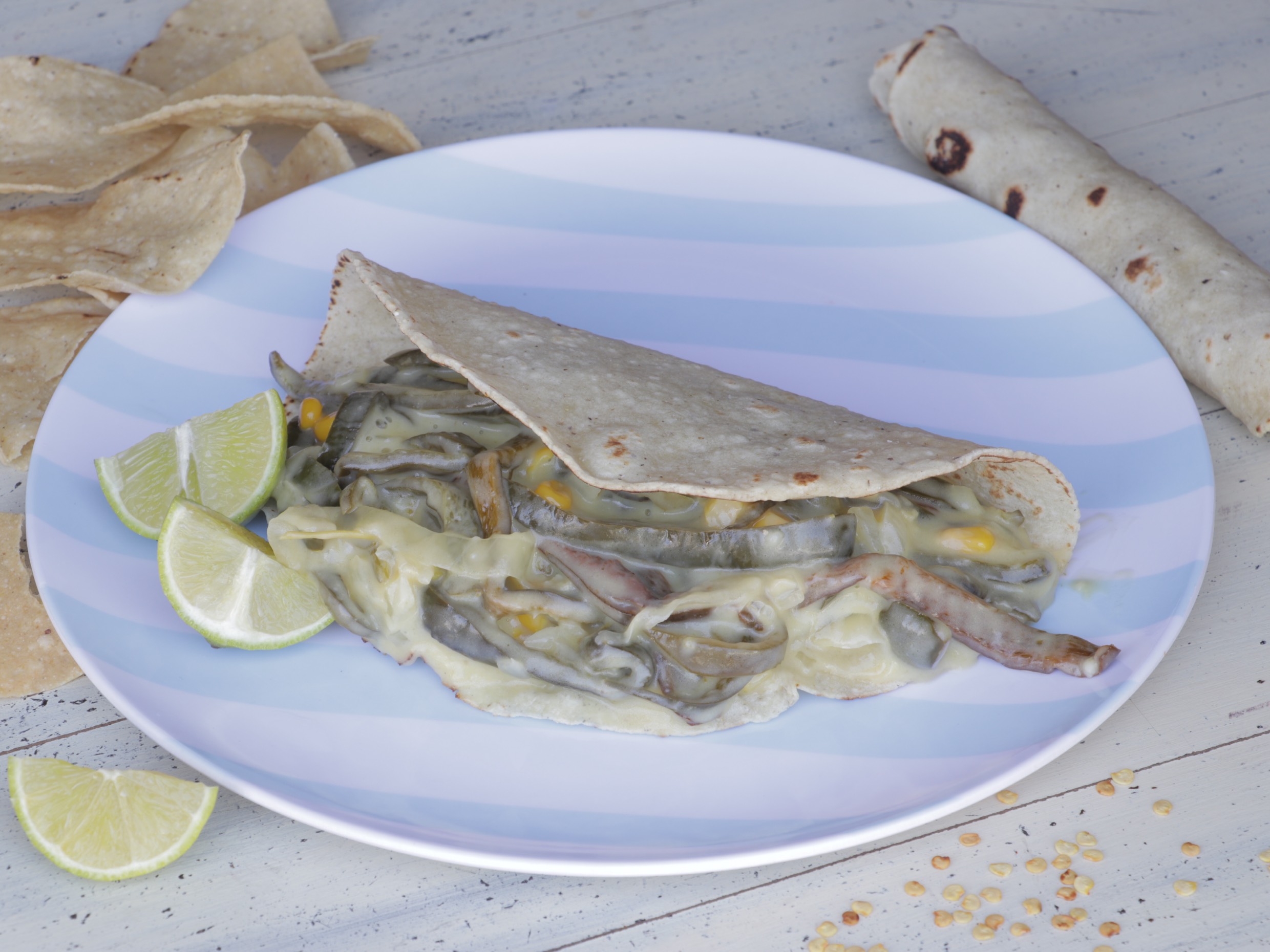 Hecha con tortilla grande de comal, acompañada de queso asadero gratinado y el guisado de su elección.
