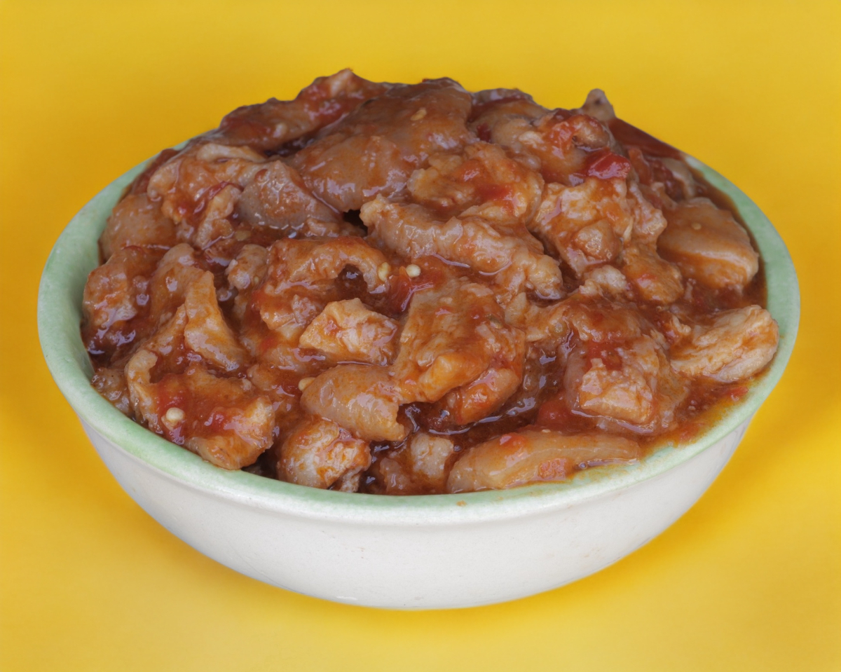 Termo de medio litro de chicharrón prensado guisado en salsa roja.