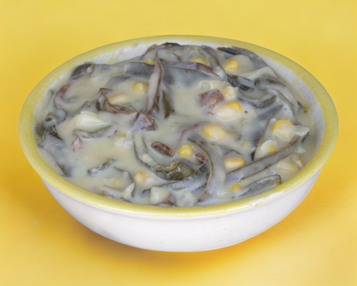 Termo de medio litro de rajas de chile poblano guisadas en crema con cebolla y elote.