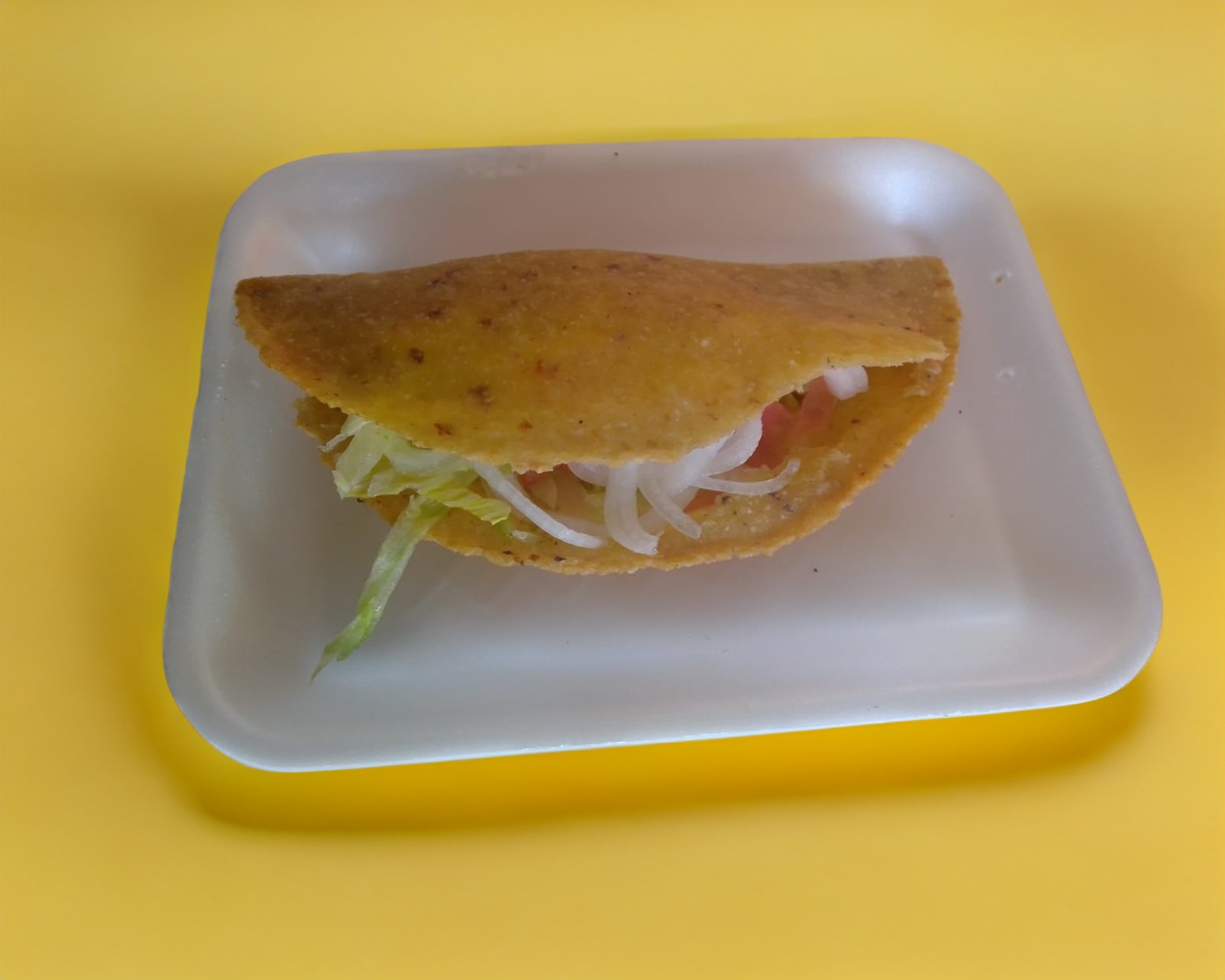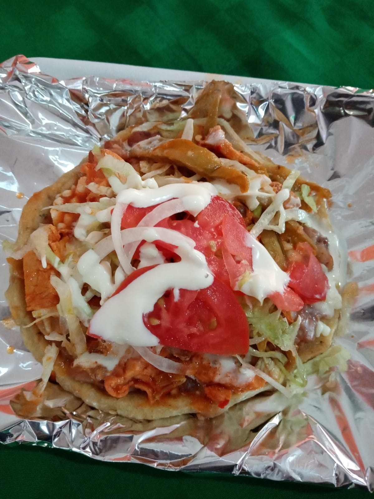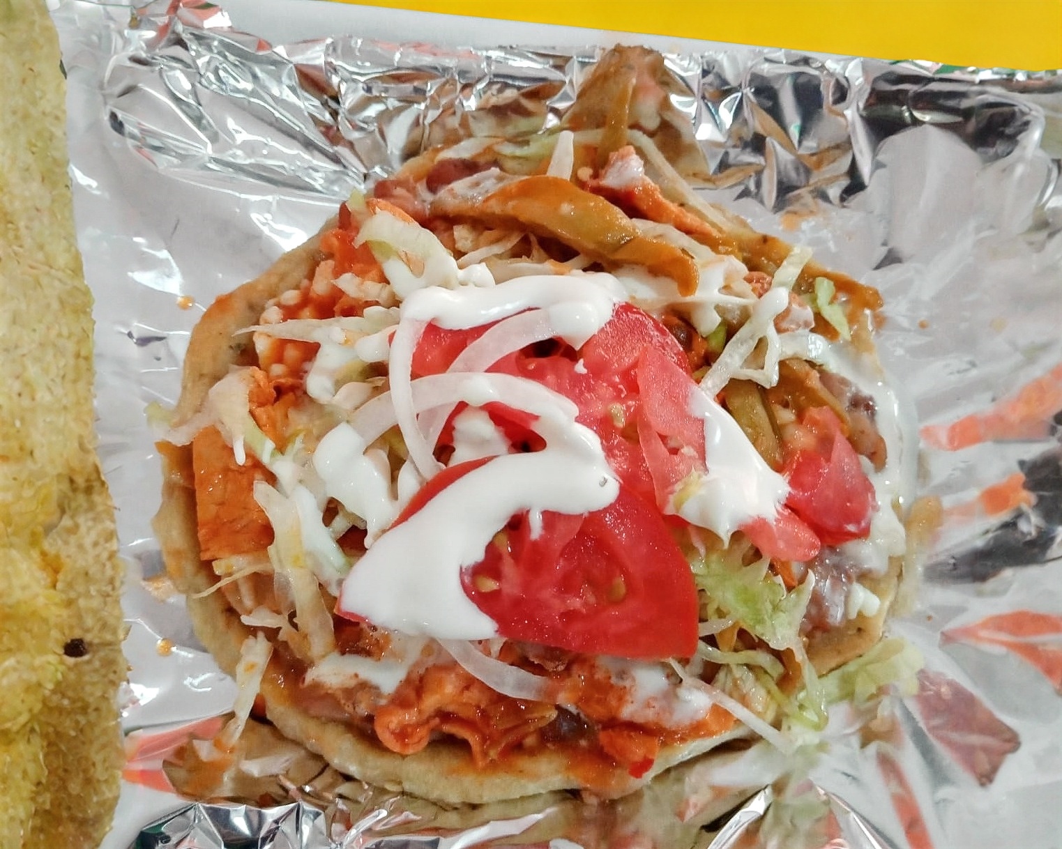 ordita de Aceite: Rellena con guisado al gusto, acompañada de lechuga, cebolla, tomate y crema.