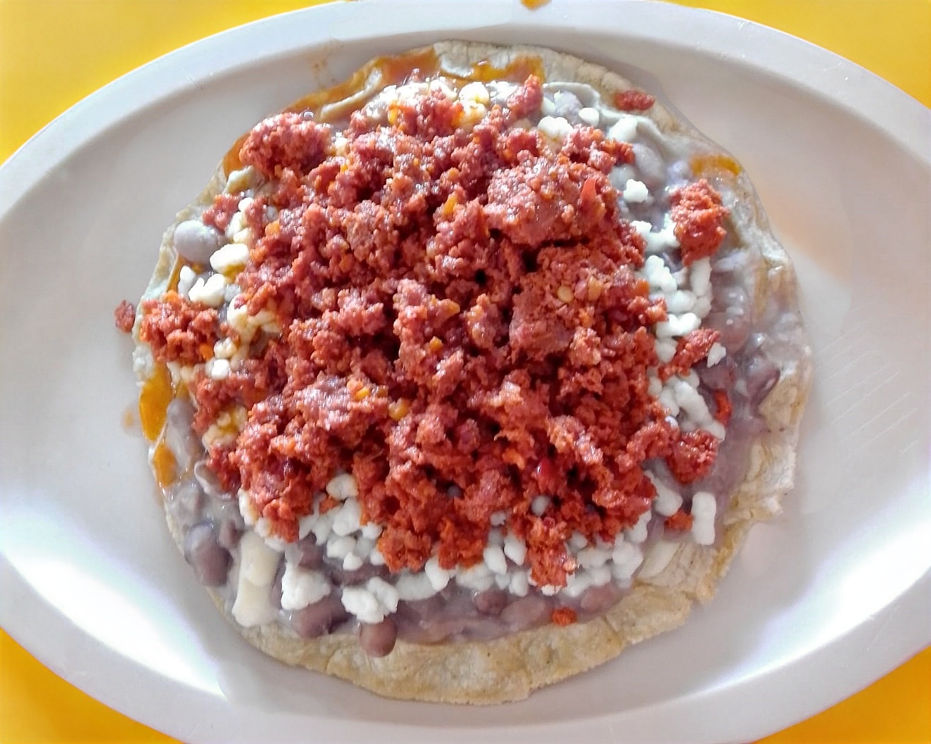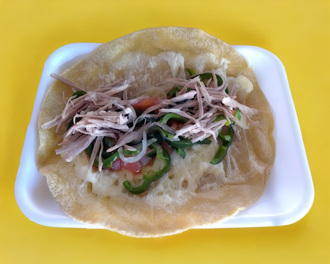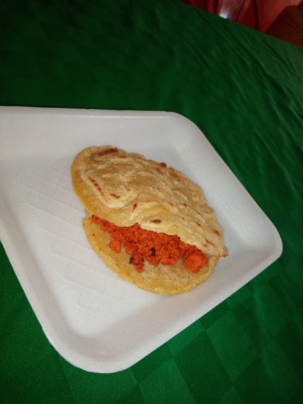 ordita de Aceite: Rellena con guisado al gusto, acompañada de lechuga, cebolla, tomate y crema.