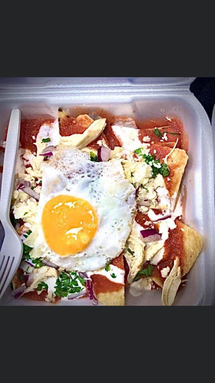 Deliciosos chilaquiles en salsa de chile morita, acompañados de crema, queso, cilantro, cebolla, pollo y huevo revuelto o estrellado.