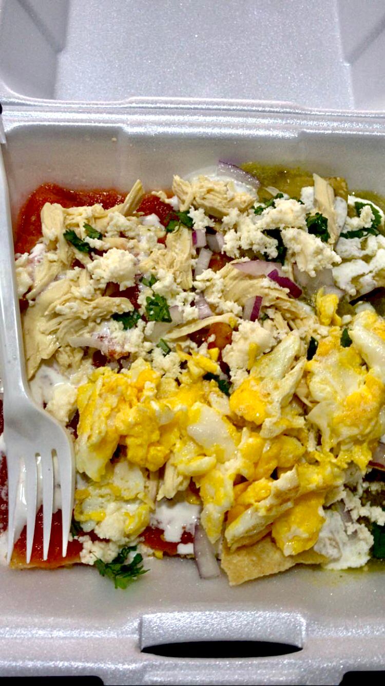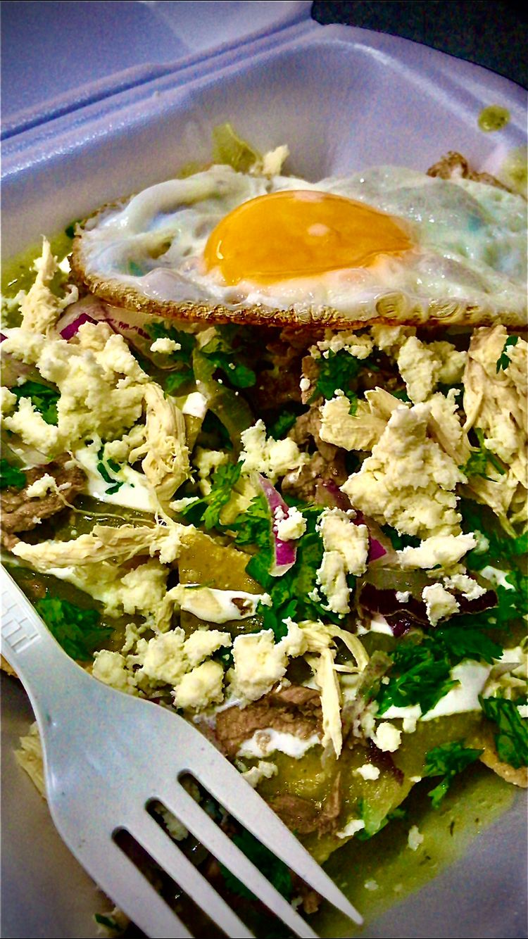 Deliciosos chilaquiles mitad en salsa verde y mitad en salsa de chile pasilla, acompañados de crema, queso, cilantro, cebolla, pollo y huevo revuelto o estrellado.