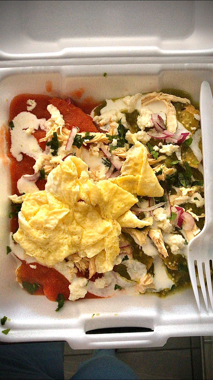 Deliciosos chilaquiles mitad en salsa verde y mitad en salsa morita, acompañados de crema, queso, cilantro, cebolla, pollo y huevo revuelto o estrellado.