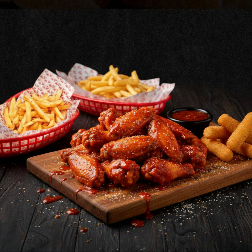 30 alitas (1.9kg crudo), con 3 salsas de tu elecciòn. Incluye 3 ranch de 2 Oz.